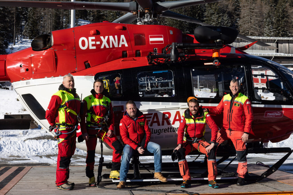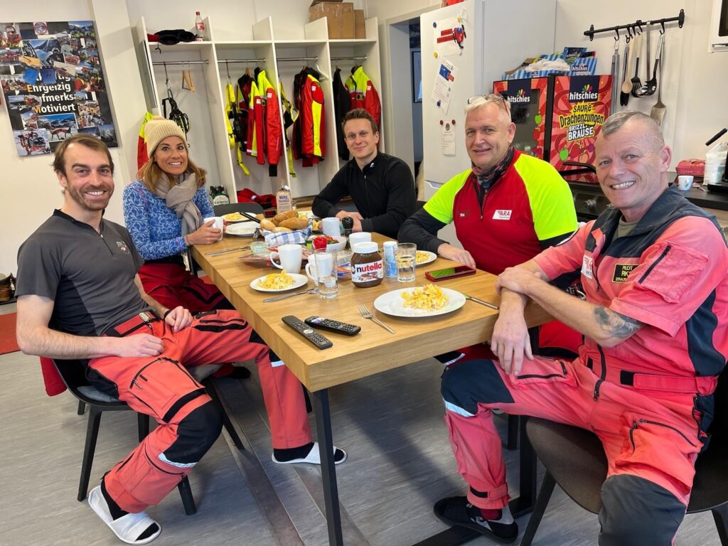 Heute gehören Pilot Jörg Straub, „HEMS-TC“ (= Helicopter Emergency Medical Services Technical Crew Member) – sprich Copilot und Windenoperator – Riccardo Mizio, sowie Notarzt Michael Obmann und Flug-